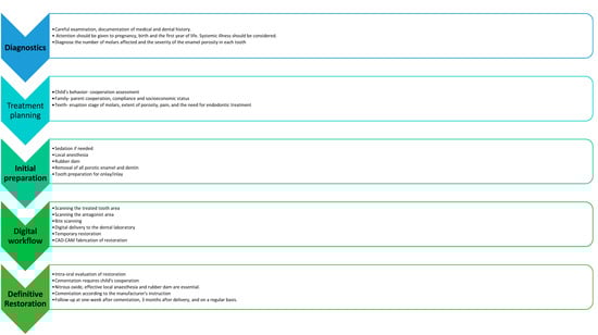 Diagnostic phase: careful examination and documentation of medical and dental history. Attention should be given to pregnancy, birth, and the first year of life. Information on systemic illness should be obtained. It is crucial to diagnose the number of molars affected and the severity of the enamel porosity in each tooth.
