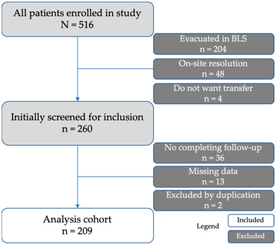 Cases of cardiorespiratory arrest, pregnant women, patients transported on basic life support or discharged in situ were excluded. When the scene was not safe (e.g. attacks), the patient was not assessed for eligibility. Similarly, excluded from the study were those cases in which it was not possible to obtain informed consent or where the vital signs necessary to calculate the scores were not collected in full. Repeat cases were filtered and only the first event for a given patient was considered.