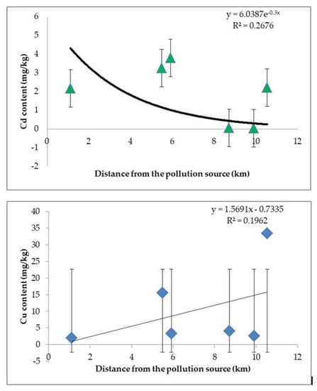 From the Figure, concentrations of Cd in honey show a decreasing trend while moving away from the source of pollution, while Cu concentrations are increasing (Figure 2). Levels of Pb and Zn vary independently of the distance from the source of pollution (Spearman rank-order correlation = −0.029, p = 0.96).