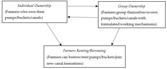 Agriculture is the backbone and the principal sector of the economy in Tanzania. Its performance creates a substantial effect on food security as well as poverty and income [16]. Food Agricultural Organization (FAO) [2] reported that agriculture accounts for 75% of the rural household income, 45% of the Gross Domestic Product (GDP), and 80% of employment in Tanzania. Compared to other sectors, agriculture indirectly induces economic growth through enormous consumption associations. In Tanzania, there are three distinct farmer-led irrigation practices, namely, petrol pump irrigation, bucket irrigation, and furrow irrigation. These techniques have emerged as the predominant farming methods that smallholder farmers have used to draw water from lakes, rivers, and wells to facilitate intensive horticultural production in the past decade. Particularly, furrow irrigation entails constructing and maintaining informal water canals. The first constructors are the initial owners and they take control of the water maintenance and distribution among member farmers. However, new construction or improvement of the canals attracts new users or a reconfiguration of rules and ownership. On the other hand, petrol pumps and water buckets are shared among farmers through borrowing, renting, or purchasing a new set. Also, farmers group themselves to buy new ones with ground rules on how to share and use the pump/buckets. Figure 1 explains the rationale for farmers developing, maintaining, and running this particular practice by themselves. Moreover, this agricultural practice is locally centralized and horizontal. This is typically an improved mode of farming compared to the top-down government-initiated projects. Further, farmer-led irrigation is region specific.