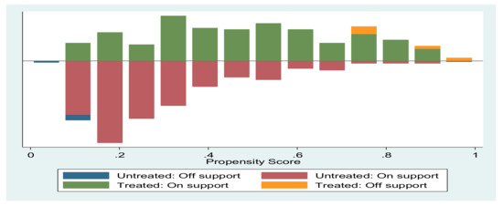 Within the PSM framework, we used three matching methods: nearest neighbor matching, radius matching, and kernel-based matching to estimate the Average Treatment Effects on the treated (ATE). We computed ATE after matching as illustrated in Table 3. Further, the propensity score ranged between 1 and 0 for both the treated and control groups. We present the results of the three matching algorithms in Table 3. From the results, we deduced that the adoption of farmer-led irrigation creates a significant positive effect on smallholder farmers’ per capita net crop income. This is consistent with several studies on the impacts of agricultural technologies on productivity and welfare [46,47,48,49,50,51]. The three matching methods displayed consistent results; thus, the adopters had a higher per capita net crop income compared to the matched nonadopters. Assuming that the treated and the control groups were matched on equal propensities, and based on the findings, we conclude that the variations in per capita net crop income are a result of adopting farmer-led irrigation. Similarly, the significant positive effects of this initiative provide strong implications for the smallholder farmers as well as the development researchers since small-scale farming is the predominant farming method in Tanzania and other sub-Saharan countries. Hence, any improvement in crop income leads to a substantial improvement of the farmers’ food accessibility, availability, and security.