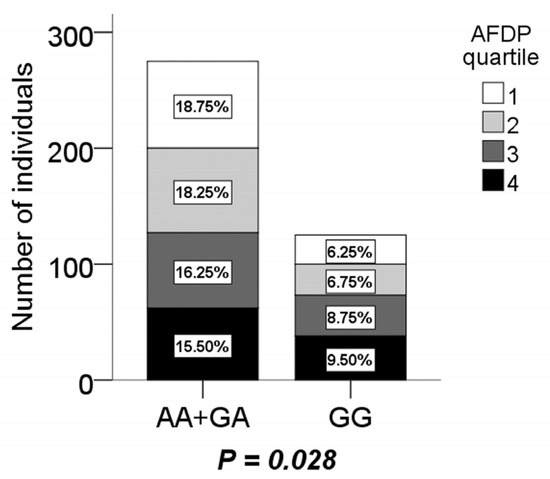 The distribution of boys with the AA + AG and GG genotype in the animal food-based dietary pattern (AFDP) quartile. The last quartile of the AFDP compared to the first quartile had a significantly higher percentage of individuals with the GG genotype, but lower with the AA + AG genotype.