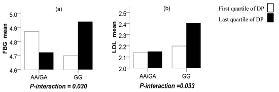 Through a more in-depth study, significant interactions were observed between the CMTM7 rs347134 polymorphism and NSDP in terms of FBG (P-interaction = 0.030), in such a way that the last quartile of the NSDP compared to the first quartile increased the terms of FBG with the GG genotype (P = 0.031) while reducing them for those carrying the AA + GA genotypes (P = 0.040). Significant interactions were also observed between the CMTM7 rs347134 polymorphism and AFDP in terms of LDL (P-interaction = 0.033), in such a way that the last quartile of the AFDP compared to the first quartile increased the terms of LDL with the GG genotype (P = 0.038) while having no difference for those carrying the AA/GA genotypes (P = 0.243) (Figure 2).