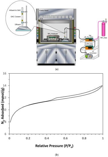 The dynamic adsorption studies were completed using a bench scale experimental setup [47]. Figure 1a provides the layout of respective setup that was used for the gaseous ammonia dynamic adsorption experiments. It consisted of following major individual components: Ammonia gas standard cylinder, high purity air supply unit, standard flow meters connecting the gas sources to the activated carbon column via a series of valves to control gas flow and gas concentration, GAC column, and ammonia gas analyzer. The column containing the produced GAC (through which gaseous ammonia was passed continuously) was made of Fluorinated Ethylene Propylene (FEP) tubing with an inner diameter of 6.35 mm and outer diameter of 7.938 mm. The column was first provided with an inert support at the bottom followed by GAC filling that was then topped with the same inert material. The specific and separate gas flows from the high purity air supply source (Thermo Scientific, Model 111, Waltham, MA, USA) and the standard ammonia gas cylinder were obtained using separate/dedicated standard flow controllers (Cole Palmer, Vernon Hills, IL, USA). After this, the continuous streams from the high purity air source and ammonia gas standard were mixed (at specific flow rates) to realize the desired influent gaseous ammonia concentration (for the adsorption experiment). The respective gaseous ammonia stream was then continuously passed in a down flow direction through the above mentioned GAC column. The effluent/exiting gas (after treatment) was then tested as described in Section 2.4. The gaseous ammonia removal experiments were conducted at different process conditions including varying flow rates and ammonia concentrations. The obtained responses included the Breakthrough Time (run time at which 5% of influent ammonia is exiting the column) and Exhaustion Time (run time at which 95% of influent ammonia is exiting the column). To obtain these responses, the effluent ammonia results were plotted against time for the whole test duration.