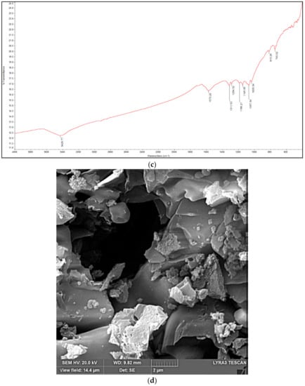 The specific surface area (SSABET) of the produced activated carbon was determined employing a state-of-the-art physio-sorption setup (ASAP 2020, Micromeritics, Norcross, GA, USA). The conventional nitrogen adsorption equilibrium data as given in Figure 1b was eventually employed for the respective analysis. The specific surface area (SSABET) value of produced GAC was determined to be 822 m2/g. The respective average pore width was determined to be 23.01 Å ((4V/A) by BET)). The results indicated most specific surface area, i.e., 735 m2/g to be in the porous region of produced GAC. The total carbon content (w/w) of respective activated carbon was determined to be around 82% (AnalytikJena Multi EX 2000, Jena, Germany). The Fourier Transform Infrared Spectroscopy (FTIR) characterization of the produced date pits based GAC was also completed employing the Fourier transform infrared technique (FTIR, Thermo Scientific, Waltham, MA, USA). The respective findings are given in Figure 1c. The salient functional groups, as noted from the respective FTIR characterization, at the GAC surface, included O-H, C-H, C–O, and S=O. The respective surface functional groups are expected to initiate ammonia uptake by the activated carbon. Furthermore, hydrophobic interactions and hydrogen bonding transpiring between the ammonia molecules and surface oxygen based functional groups can also initiate and enhance gaseous ammonia adsorption on activated carbon surface [22]. These results are invoked later to explain the ammonia adsorption results. The effluent/exiting gas (after treatment) from dynamic continuous gas flow experiments was tested using a state-of-the-art gaseous ammonia analyzer (Model 17i, Thermo Scientific, Waltham, MA, USA). Furthermore, Figure 1d provides the SEM results for the date pits based GAC. The respective results indicate a porous structure that eventually helps to adsorb the target pollutants that is similar to as noted in previous studies for activated carbon [48].