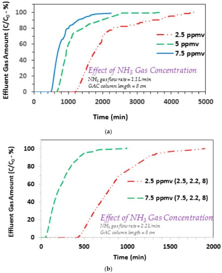 Initially, a set of experiments were conducted to assess the effect of influent ammonia concentration on to its adsorption based removal. To that end, several experiments were conducted at varying influent gaseous ammonia concentrations, using GAC column lengths of 6 and 8 cm. The initial experiments were conducted between 2.5 and 7.5 ppmv gaseous ammonia for the 8 cm GAC column. The respective findings are shown in Figure 2a,b, at gas flow rates of 1.1 and 2.2 L/min, respectively. It is evident that with a gradual decrease in the influent ammonia concentration, the breakthrough point also shifts towards longer times. For example, the results in Figure 2a show the following breakthrough trend: 1295 min (2.5 ppmv) > 712 min (5 ppmv) > 532 min (7.5 ppmv). Furthermore, the exhaustion time values for the respective experiments also show higher run times at lower gaseous ammonia concentrations, i.e., 4000 min (2.5 ppmv) > 2312 min (5 ppmv) > 1574 min (7.5 ppmv). Furthermore, the adsorption trends in Figure 2 typically show a broader adsorption breakthrough curve that indicates comparatively larger length of the mass transfer zone (MTZ). This is somewhat different from the adsorption of benzene onto DPP based GAC that showed a sharp breakthrough curve [24]. Such a different trend in case of ammonia may be ascribed to basic nature of ammonia moieties that can interact with the surface acidic groups [29]. An increase in the incoming gaseous ammonia and its transfer from the bulk gas phase to the surface of GAC, will initiate a faster consumption of GAC surface adsorption sites (including those in the pores). As the respective surface adsorption sites are fixed and limited, it is expected that an earlier breakthrough and also an earlier exhaustion, will transpire at higher influent ammonia concentrations. Furthermore, additional experiments conducted under similar conditions but at 2.2 L/min, also show qualitatively similar trends (Figure 2b). The effect of varying influent gaseous ammonia concentration on to breakthrough/exhaustion was further investigated using a 6 cm GAC column at 3 and 10 ppmv ammonia. The respective findings are given in Figure 3. Similar to Figure 2 findings, an increase in the gas concentration from 3 to 10 ppmv, reduces the breakthrough time from 595 and 159 min, and the exhaustion time from 1231 to 354 min.