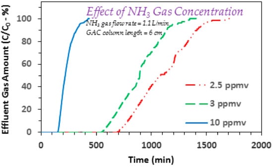 Effect of influent ammonia gas concentration on the adsorption breakthrough curve profile of ammonia gas on to GAC produced from date palm pits (GAC SSABET = 822 m2/g and average pore width = 23.01 Å; ammonia/NH3 gas flow rate = 1.1 L/min; influent ammonia/NH3 gas concentrations 2.5, 3, and 10 ppmv; GAC column length = 6 cm; GAC bed dia. 6.35 mm).
