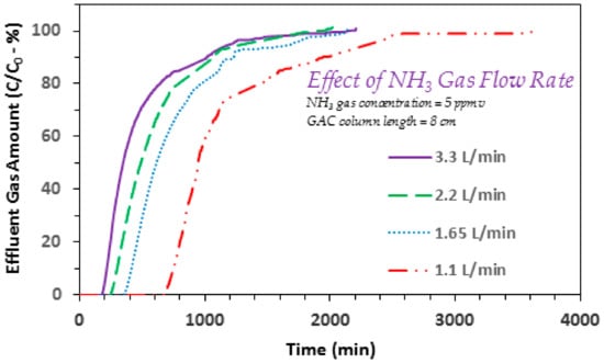 Effect of influent ammonia/NH3 gas flow rate on the adsorption breakthrough curve profile of ammonia gas on to GAC produced from date palm pits (GAC SSABET = 822 m2/g and average pore width = 23.01 Å; ammonia/NH3 gas flow rates = 1.1, 1.65, 2.2, and 3.3 L/min; influent ammonia/NH3 gas concentrations 5 ppmv; GAC column length = 8 cm; GAC bed dia. 6.35 mm).