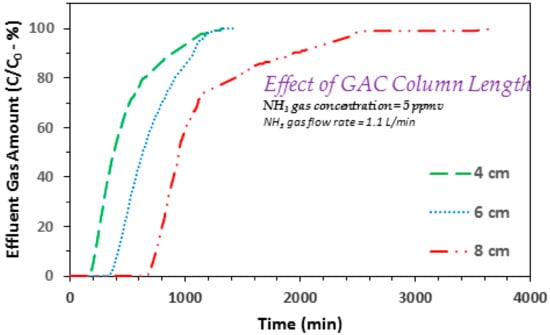 Effect of GAC column length on the adsorption breakthrough curve profile of ammonia gas on to GAC produced from date palm pits (GAC SSABET = 822 m2/g and average pore width = 23.01 Å; ammonia/NH3 gas flow rate = 1.1 L/min; influent ammonia/NH3 gas concentrations 5 ppmv; GAC column lengths = 4, 6, and 8 cm; GAC bed dia. 6.35 mm).
