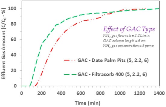 These mechanisms could also possibly explain the broader ammonia adsorption curves a noted in Figure 2, Figure 3, Figure 4 and Figure 5. Furthermore, to check out the data reproducibility, two experiments for 5 ppmv ammonia gas concentration, at 1.1 L/min gas flow rate and GAC column length of 4 cm, yielded breakthrough time values of 197 and 227 min. Similarly, another set of experiments completed at 5 ppmv ammonia gas concentration, 1.1 L/min gas flow rate and GAC column length of 8 cm, yielded breakthrough time values of 712 and 750 min. These values are close, especially for the bench scale dynamic flow studies. It should also be noted that real life applications require the GAC column length to be larger than the critical GAC bed depth, i.e., column length just enough to avoid breakthrough at time zero. These observations suggest a longer GAC column length for gaseous ammonia adsorption. These findings show that with a careful selection of respective operational design parameters, the date palm pits based GAC can be successfully used for gaseous ammonia treatment. To build on these encouraging results, a commercial GAC was also used for comparison purpose, and the respective findings are given below.