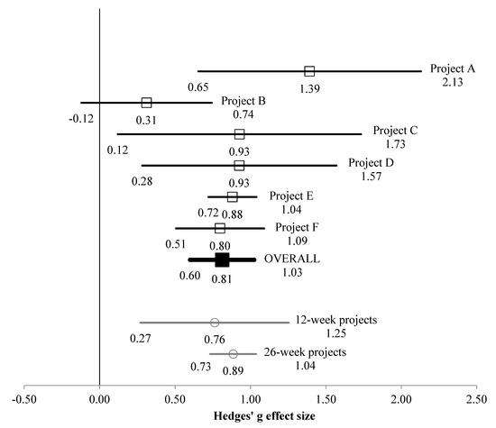 Mean and SD values by time-point across projects and samples are shown in Table 1. For the whole sample, the multi-study-analysis effect size was g = 0.812 (95% CI [0.599, 1.025], p < 0.001; see Figure 1), which can be considered to be large [32,33,34]. This is likely to be an overestimate [35], so should be interpreted with caution. Tests of heterogeneity found that variation in effect size between projects was not statistically significant (p = 0.138); the calculated I2 value indicated that 40% of the observed variance in Δ wellbeing scores between projects was due to real differences, with the remaining 60% due to sampling error, which represents low to moderate heterogeneity [36]. A priori moderator analysis found that there was not a statistically significant influence of project duration on Δ wellbeing. Further moderator analysis indicated that the wellbeing scale version used to measure wellbeing did not significantly affect the results within the multi-study analysis; see respective Q and p values in Table 2.