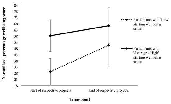 ‘Normalised’ percentage wellbeing scores by time-point across projects and categorised starting wellbeing status.