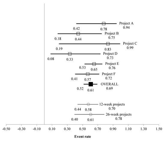In total, 129 participants were categorised as having ‘low’ starting wellbeing (49 males, 71 females, 9 did not report their sex; aged 21.2 ± 18.7 years, 23 participants did not report their age). For the low wellbeing subsample, the multi-study-analysis event rate was 0.608 (95% CI [0.518, 0.691]), indicating that the interventions led to 60.8% of ‘low’ starting wellbeing participants moving into the average–high wellbeing group by the end of their project engagement (Figure 3). Tests of heterogeneity found that variation in effect size between projects was not statistically significant (p = 0.409); the calculated I2 value indicated that only 1.2% of the observed variance in Δ wellbeing scores between projects was due to real differences, with the remaining 98.8% due to sampling error, which represents low heterogeneity [36]. Other multi-study analysis statistics are presented in Table 2.