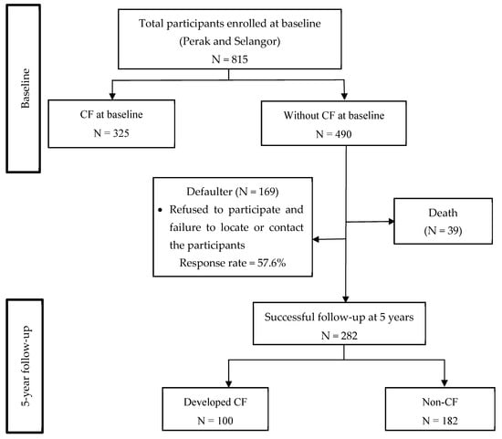 This is a follow-up study of the Longitudinal Study on Neuroprotective Model for Healthy Longevity (LRGS TUA) cohort [] at the 5 years endpoint. At the baseline, a total of 815 older adults consisting of 372 men and 443 women were recruited through a multi-stage random sampling procedure from two states, namely Selangor and Perak (representing central and northern regions of Malaysia), as reported earlier []. A total of 325 participants were categorized into the CF group at the baseline, while another 490 participants were grouped in non-CF (Figure 1). It is noteworthy that only non-CF participants were included in the follow-up assessments for the incidence analysis. After 5 years, 39 participants had died, while 169 participants refused to participate and failed to be located or contacted. Hence, a total of 282 non-CF participants at the baseline were successfully followed up at 5 years. Different fieldworkers were recruited for the follow-up assessments to comply with the blinded assessors criteria. This study was approved by the Medical Research and Ethics Committee of the Universiti Kebangsaan Malaysia (UKM1.21.3/244/NN-2018-145). A written information was given, and informed written consent was acquired from all participants prior to participation.