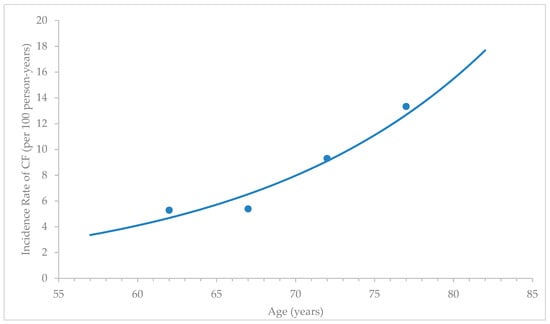 The cumulative incidence for CF was calculated using the number of new cases of CF during the follow-up period divided by the number of participants at risk in the population at the beginning of the study. The CF incidence rate was calculated as the number of new cases of CF divided by the total person-time observed between the two assessments. The age-specific incidence rate of CF was computed for 5-year age categories (60–64, 65–69, 70–74, and 75 years and above) using a person-years analysis. Participants were considered at risk and contributed to the person-years from the date of their baseline evaluation to the date of the follow-up where they were determined to have CF or not. The age-specific incidence rate curve was modeled using the Microsoft Excel database.