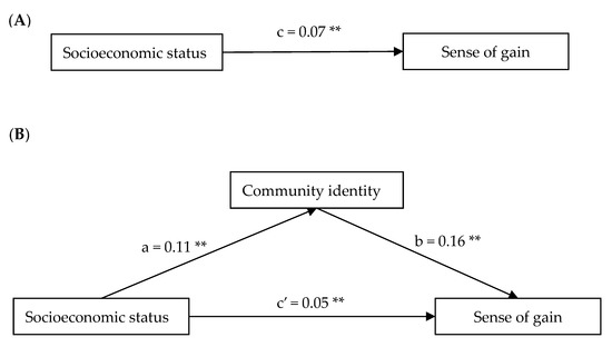 Tests of the theorized mediation model. (A) The total effect (socioeconomic status predicting sense of gain). (B) The indirect effect (with community identity as mediator). Indirect effect, a × b (β) = 0.02, p < 0.01. Standardized regression coefficients are displayed. * p < 0.05, ** p < 0.01.