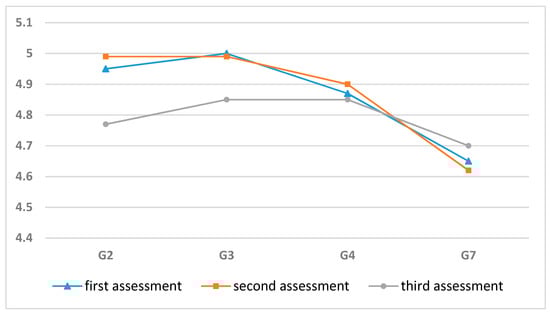 Correlation-sample single-factor ANOVA (repeated quantity) results demonstrated that the average values from the three assessments in G2 were significantly different (F (1.224, 102.819) = 6.709, p < 0.01). Furthermore, no significant difference was noted between Assessments 1 and 3, but the other values exhibited significance, demonstrating a decrease first and then an increase. Thus, over the Grades 2–4 movement in elementary school, the depth perception of students significantly improved first and then decreased significantly, but depth perception did not differ significantly in G2 between Grades 2 and 4.