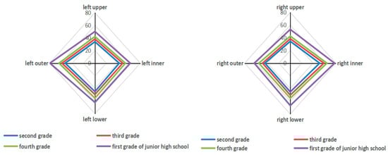 Figure 2 displays the representative average visual field value of students in different grades in Assessment 1. These data demonstrate that the visual field of students in higher grades was wider than that of students in lower grades, according with the general development of the adolescent visual field [].