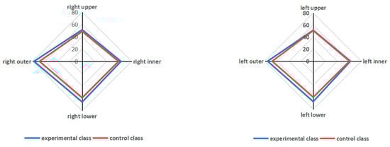 Next, for the right eye, the students’ visual field in the upper direction was significantly higher than that of the left eye in the upper direction, and the average value was gradually increased. Only Assessment 1 data for the internal orientation of visual field in the left eye were significant, with the average demonstrating a gradually increasing trend. For the lower and outer visual field, only Assessment 1 data were significant: The average increased first and then decreased, but without significance (leading to very high F- and p-values; decreased 0.1 and 0.7, respectively).