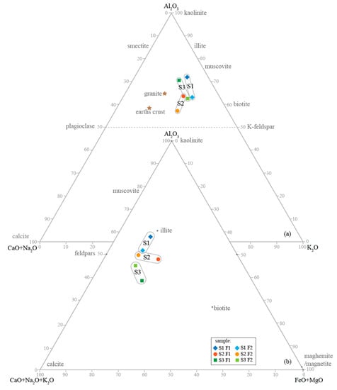 Ternary diagrams (a) Al2O3—CaO+Na2O+K2O—FeO+MgO, and (b) Al2O3—CaO+Na2O+K2O—FeO+MgO of the studied samples (adapted from [58]). Stars plotted indicate the average composition of the Earth’s crust and granite [20]. S1—suburban street, cobbled pavement; S2—urban street, asphalt pavement; S3—central avenue, cobbled pavement.