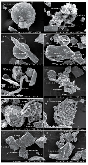 SEM images and composition of anthropogenic and geogenic road dust particles: (a–f) plerospheres, cenospheres, aggregates, plate like particles and fibrous steel with considerable plastic deformation and fragmentation; (g) irregular aggregates; (h) porous Ca-Si-Fe rich particle; (i,j) well-formed minerals.