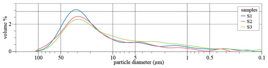 The grain size distribution of road dusts is presented in Figure 3. Results show a similar pattern for both suburban (S1) and urban areas (S2 and S3) with a marked unimodal distribution. The mass volume of particles peaked in the range from 10 to 106 µm, although small modes, barely noticeable, were observed below 5 µm. Particles < 100 µm can easily be resuspended in the wake of passing traffic or by the blowing wind and might enter the mouth and nose while breathing. Particulate matter of 10 and 2.5 µm or less in diameter (PM10 and PM2.5, respectively) can get deep into the lungs and some may even get into the bloodstream. Urban sample S3 presented a higher percentage of PM10, with S3PM10 37.8% > S1PM10 27.2% > S2PM10 25.0%, while PM2.5 represented a smaller fraction, with 4.5% (S3) > 3.0% (S1) > 2.7% (S2) of the total mass volume. A literature review by Grigoratos and Martini [66] documented unimodal mass size distributions of brake wear PM10, with a mass weighed mean diameter of 2–6 μm. On the other hand, tyre wear PM10 often exhibits a bimodal distribution with one peak lying within the fine particle size range and the other one within the coarse range (5–9 μm). It is estimated that almost 40%–50% by mass of generated brake wear particles and 0.1%–10% by mass of tyre wear particles is emitted as PM10. In terms of mass, more than 85% of diesel particulate exhaust emissions are below 1 µm. Gasoline vehicles emit an even higher proportion of smaller particles than diesel vehicles [67].