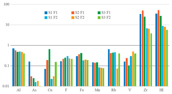 Cluster analysis of the XRF results (Figure S2) of the studied samples (S1 suburban environment influenced by agricultural activities; S2 and S3 urban streets) confirmed the chemical difference between the two analysed fractions (F1 with samples <0.074 mm; F2 with sizes >0.074 mm and <1 mm). Elemental concentrations (Table 1) revealed Si as the most representative constituent, followed by Al > K > Fe > Ca > Na. The highest Si content was found in F2 (fraction >0.074 mm and <1 mm). The enrichment index (Figure S3) suggests a low influence of anthropogenic activities in both size fractions (EI < 1.5). Crustal erosion and parent materials (e.g., Variscan granite parent rock) may also influence the concentrations of other elements, such as Fe, Al, Mg, Mn, Rb, Na, Ti, Mo, V and Zr [31]. Previous studies suggest that heavy metals such as Mn, V, Cu, Fe, Ni, Pb and Zn are linked to traffic emissions [32,33]. Low enrichment indices (<3) were also obtained for manganese, indicating a major natural source. However, this element is used in fuel additives, aluminium based alloys offering a high corrosion resistance and formability, vehicle applications, such as inner panels, and heater and radiator tubes.