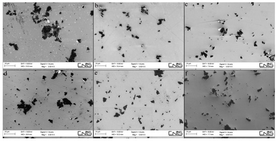 FE-SEM images of the size (µm2) of the GNPs in the six different groups: (a) GNPs1050°/1, (b) GNPs1050°/2, (c) GNPs1050°/3, (d) GNPs1150°/1, (e) GNPs1150°/2, (f) GNPs1150°/3.