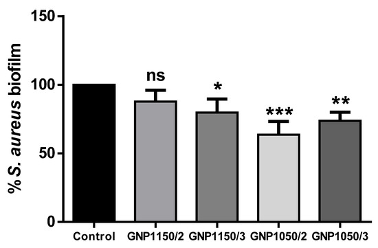 Biofilm formation was analyzed by the crystal violet binding assay in S. aureus cells. The production of bacterial biomass was evaluated. The production of bacterial biomass was evaluated for each of the four groups of Ti-disks coated by GNPs, and expressed as biofilm formation relative to uncoated Ti-disk samples (control group). Statistical significance: * p < 0.05, ** p < 0.01, *** p < 0.001, and ns = not significant.