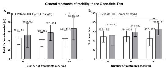 These results are consistent with our measures of mobility time, even though the effect of fipronil treatment on relative mobility time is not significant (two-way RM ANOVA). While vehicle-treated animals spent only about half of their time in the open-field arena mobile (48.81% ± 12.22%, 49.07% ± 12.23%, 44.94% ± 16.66% respectively), the relative mobility time of fipronil-treated animals increased with treatment duration (Figure 2B). Thus, fipronil-treated animals spent significantly more time mobile during the last session of open-field testing than during the first session of open-field testing (50.98% ± 20.88% vs. 65.267% ± 13.08%; p = 0.0297, Tukey’s multiple comparisons test). In addition, the fipronil-treated animals spent significantly more time mobile during the third and last session of open-field testing than the vehicle-treated animals (p = 0.0093, Student t-test).