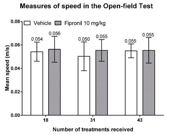 In order to evaluate whether the differences in total distance travelled observed in the open-field test were due to differences in velocity between treatment groups, we analyzed the mean speed displayed by the two treatment groups during the 30 min of free exploration in the open-field arena. Fipronil treatment had no significant effect on mean speed displayed by the animals during the 30 min of free exploration in the open-field arena, thus there was no significant difference in mean speed between treatment groups at any timepoint (two-way ANOVA, Student t-test). Hence, for both treatment groups, the mean speed remained essentially constant among the three sessions of open-field testing (vehicle-treated animals: 0.054 ± 0.008, 0.050 ± 0.012, 0.055 ± 0.006 m/s, respectively; fipronil-treated animals: 0.056 ± 0.011, 0.055 ± 0.009, 0.055 ± 0.011 m/s, respectively) (Figure 3).