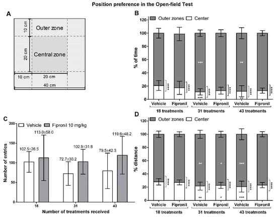 As total distance travelled and mobility time varied between treatment groups, we calculated the relative time spent and the relative distance travelled in the different zones of the open-field arena. All animals displayed a position preference in the open-field arena (p < 0.0001, two-way ANOVA) (Figure 4B,D, Table 1). There was no significant difference in thigmotaxis between groups for any of the open-field testing sessions (Student t-test). During all sessions, all the animals spent significantly less time and travelled significantly less distance in the center zone of the open-field arena than in the peripheric regions (Student t-test, p < 0.0001 for all). Both, the vehicle-treated and fipronil-treated animals, travelled significantly less distance in the center zone of the open-field arena during the second session of behavior testing (p = 0.0017 and p = 0.0426 respectively, Tukey’s multiple comparisons test). Further, the vehicle-treated animals also travelled significantly less distance in the center zone during the third session of testing than during the first (p = 0.0005). Considering the relative time spent in the different zones of the open-field arena, this shift is less visible: only the vehicle-treated group showed a shift of thigmotaxis during the second and third session of OFT. In both, the second and the third session, vehicle-treated animals spent significantly less time in the center zone and thus significantly more time in the outer zone of the open-field arena than during the first session (p = 0.0004 and p = 0.0014 respectively). The analysis of the number of entries into the central zone (Figure 4C) revealed that neither treatment type nor treatment duration had a significant effect on this parameter (two-way RM ANOVA) and no significant differences between the treatment groups could be revealed (Student’s t-test). However, we can see a tendency to enter the central zone less frequently with increasing treatment duration for the vehicle-treated animals, which seems coherent with the results observed for the relative time spent and distance travelled in this zone during sessions. In contrast, the number of entries to the center zone seems rather constant in the fipronil-treated groups, even though fipronil-treated animals also showed a tendency to spend less relative time and travel less relative distance in the central zone with increasing treatment duration.