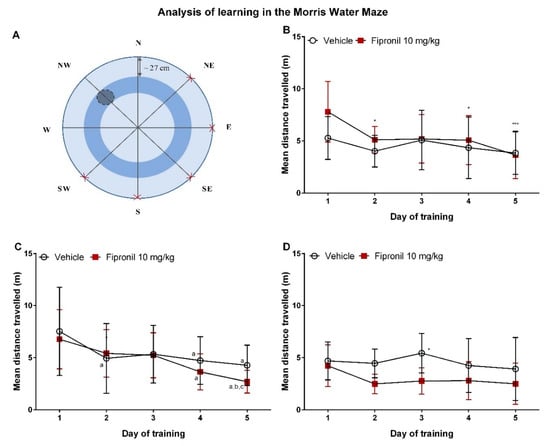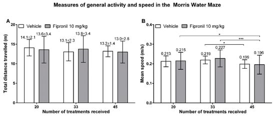 The total distance travelled during the probe trial was investigated as an indicator of activity under high stress conditions (Figure 7A). The total distance travelled by the animals remained essentially stable among the three sessions of MWM (Tukey’s multiple comparisons test). The mean value of the total distance travelled during the probe trial in the three sessions of MWM testing was 13.45 ± 0.57 m for the vehicle-treated animals and 13.46 ± 0.40 m for the fipronil-treated animals, which is consistent with the fact that no significant difference in total distance travelled was found between the two treatment groups (Student t-test).