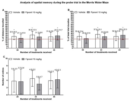 Both, the relative time spent and the relative distance travelled in the target quadrant (former platform location) during the probe trial, were evaluated, as the first can be influenced by the swimming speed of animals while the second can be influenced by animals staying near immobile in search for the platform location. Neither treatment type nor treatment duration have a significant effect on the relative distance travelled in the target quadrant during the probe trial (two-way ANOVA) (Figure 6A). Further, no significant difference in relative distance travelled in the target quadrant could be detected between the two treatment groups in any session (Student t-test). However, a Student t-test against the hypothetical value of 25% was carried out and revealed that, during the first two sessions of the Morris water maze task, only the vehicle-treated group showed a relative distance travelled in the target quadrant significantly higher than 25% (32.53% ± 8.99% p = 0.0265 and 36.36% ± 10.48% p = 0.0075, respectively). In contrast, for the last session, only the fipronil-treated animals reached a value of relative distance travelled in the target quadrant significantly higher than 25% (34.17% ± 11.74% p = 0.0473).