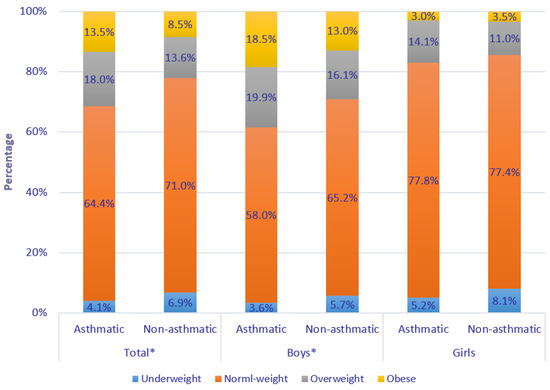 Distribution of weight status in children with or without physician-diagnosed asthma. Note: Difference of weight status between children with and without physician-diagnosed asthma was evaluated using Chi-square tests; * p < 0.05.