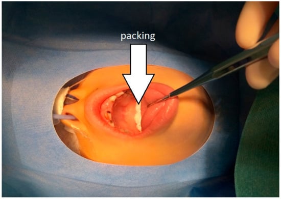 Once a week, dental practitioners from the Pediatric Dentistry department of the Strasbourg University Hospitals provide a session of care dedicated to children under GA, using an MDDS. Since the MDDS is used only one day a week, there is an increased risk linked to the possibility of backwater in the DUWL, and thus the development of a biofilm standing for a secondary reservoir of contamination. The use of a continuous water disinfection system previously showed good results in terms of microbiological quality control of the water that is used for dental procedures []. However, these results apply in general procedures, and there are no data about a prolonged contact of the disinfection product with the oropharyngeal mucosa during GA, especially regarding the possibility of its absorption in the presence of a pharyngeal packing (Figure 2). The latter is usually placed in the pharynx before starting dental procedures and is aimed to protect the airway from blood and debris, which could lead to obstruction and complications []. Therefore, we decided to use sterile water during these interventions and to implement a maintenance protocol to guarantee the safety of care when using MDDSs. Furthermore, even when using sterile water, a risk of water contamination in the DUWL still exists because of the possible back-contamination [,,].