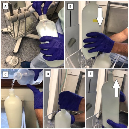 Figure 3. Parts of the maintenance protocol of the mobile dental delivery system (MDDS), before use and between each patient. (A) Purge of the air/water spray and the handpieces hoses with the Calbenium© solution; (B) removal of the reservoir that contains the Calbenium© solution; (C) filling of another reservoir with sterile water; (D,E) placement of the reservoir containing sterile water. - Leave for 5 min to act.