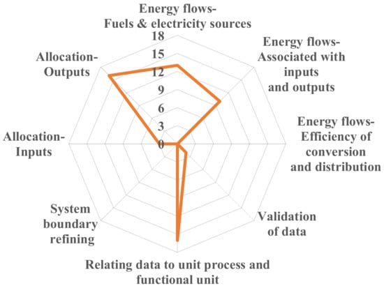 The relating of data to unit process and reference flow of the functional unit is an optional step of LCI. As shown in Figure 2, most of the selected LCA studies performed the relating of data to unit process and functional unit [3,4,11,12,13,14,15,16,17,18,19,20,21,22,23,24,25]. Two studies did not provide such information [3,9]. None of the selected LCA studies performed or provided information for the system refining based on the data processing.