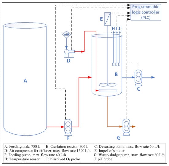 In this study, pre-denitrification and post-denitrification processes were investigated in the SBR process to find the most appropriate method for the removal of pollutants. Figure 1 shows a schematic diagram of the pilot-scale SBR system used in the present work. The system consists of a feed tank with a capacity of 700 L and a cylindrical oxidation reactor with a capacity of 300 L, which were made from inert, transparent methacrylate material. The oxidation reactor includes a stainless-steel agitator and air diffuser. The system comprised (1) feeding, decanting, and waste-sludge pumps with a maximum flow-rate of 60 L h−1; (2) a diaphragm compressor with a stainless-steel body and flow rate of 1.2 Nm3 h−1; and (3) a flowmeter for measuring the feed flow rate of air to the reactor with a range of 0–1500 NL h−1. The pilot-SBR reactor system has a board-type microprocessor-controlled pH-meter, temperature sensor, and DO-meter with a detection range between 0 and 10 ppm.