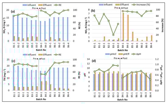 Variations of (a) nitrogen (NH3–N), (b) nitrate-nitrogen (NO3–N), (c) total nitrogen (TN), and (d) pH.