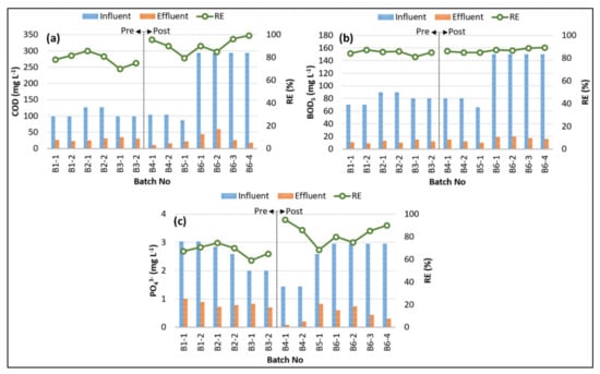 Variations and removal efficiencies of (a) the chemical oxygen demand (COD), (b) the 5-day biological oxygen demand (BOD5), and (c) phosphate (PO43−).