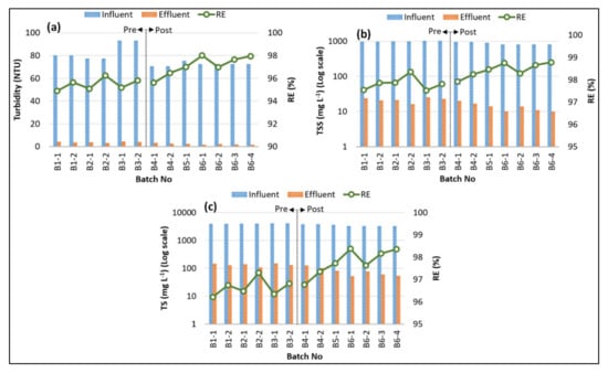 Variations and removal efficiencies of (a) turbidity, (b) total suspended solids (TSS), and (c) total solids (TS).