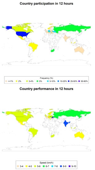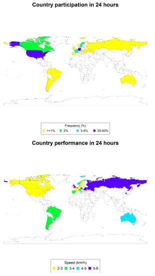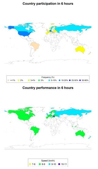 In the 6- and 24-h races, 146 (68.2%) and 441 (54.8%), respectively, came from Europe but in the 12-h races, the majority of 130 (52.6%) came from North America. In time-limited races, however, no participation was recorded before 1990 and the vast majority participated within the last 8 years. The number of observations and the average performance by sex, age groups, continent and time groups are reported for distance races, respectively, in Table 2. In Figure 1, Figure 2 and Figure 3, the participation (%) and average performances (km/h) by nationality for each time-limited race are reported. Table 3 describes the results of the statistical models, as described in the methods section. Boys were significantly faster than girls only in the 12-h race. There were no significant differences between North America, Europe and other continents.