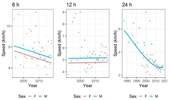 Running speed across years for time-limited ultra-endurance events for 6, 12 and 24 h. Fitted values=line, points=observed mean values.