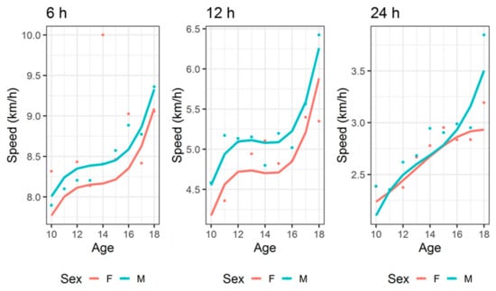 Boys were faster than girls in the 12-h races, but not in the 6- and 24-h races. This is hardly surprising, taking the physiological differences during and after maturation into account. For adult ultramarathoners, men were generally faster than women in time-limited ultramarathons (e.g., 24-h races) [6]. Women, however, have closed the gap with men in the last decade [6,17,22,23]. The mean ultra-endurance running speed was generally faster in boys than girls across all time limited ultra-endurance races; however, this was only significant for the 12-h races. Younger girls, under the age of 15 years, were faster than boys in the 6-h races. One possible explanation for the latter finding may be that girls mature physiologically earlier than boys and this may have given them an advantage at this race distance. Another explanation may be that there were far fewer girls participating at this particular race distance and that they may have been better prepared for this event.