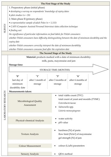 We used two methods—a survey conducted among respondents and laboratory tests of food products. The first stage of the study (survey) aimed to examined consumer knowledge and understanding of food labelling, related to the expiration date. As a logical consequence, after results evaluation, we decided to conduct the second stage of the study (laboratory tests) concerning four selected, typical, often used by Polish consumer products. The products were evaluated with a microbiological safety study, as well as physico-chemical and sensory analysis during storage after “best before” date expired (Figure 1).
