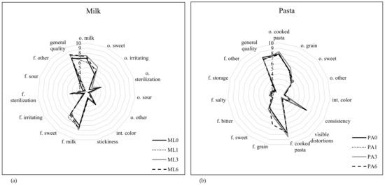 Sensory evaluation of the milk (a) and pasta (b).Explanatory notes: o–odour; int–intensity; f–flavour; ML–milk, PA–pasta; ML0 and PA0–time 0 (“best before” date); ML1 and PA1–1 month after the “best before” date; ML3 and PA3–3 months after the “best before” date; ML6 and PA6–6 months after the “best before” date.