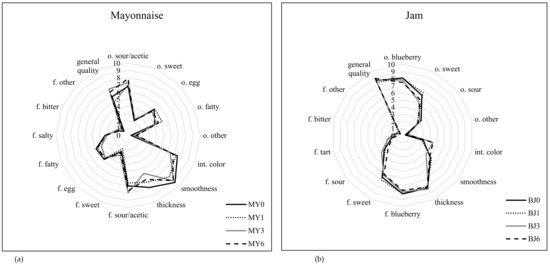 Sensory evaluation of the mayonnaise (a) and blueberry jam (b).Explanatory notes: o–odour; int–intensity; f–flavour; MY–mayonnaise, BJ–blueberry jam; MY0 and BJ0–time 0 (“best before” date); MY1 and BJ1–1 month after the “best before” date; MY3 and BJ3–3 months after the “best before” date; MY6 and BJ6–6 months after the “best before” date.