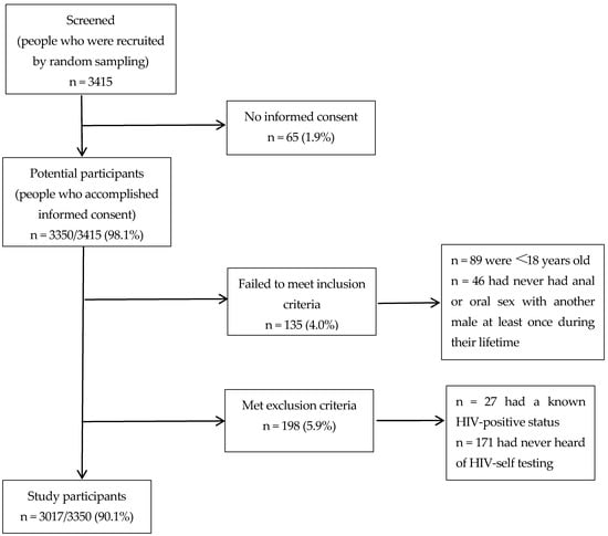 We performed a cross-sectional study, using questionnaires in Chongqing from January to December in 2017. The method was random sampling, through which Chongqing CDC staff carried out a series of HIV/AIDS information sessions in MSM venues, such as bars, bathhouses, clubs, saunas, massage parlors, and parks, and encouraged participation. Figure 1 involves a flow diagram describing the study design and the development of the final study population.