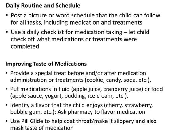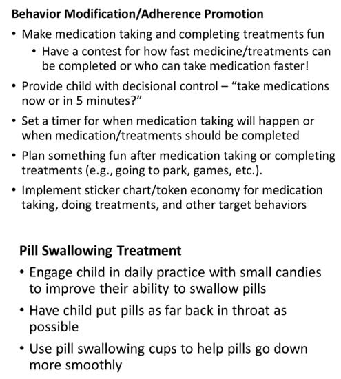 As shown in Figure 3, a number of strategies were used to improve his adherence, including developing a daily routine and schedule that allowed the patient to check off the boxes when each treatment was finished and strategies for him to anticipate when during the day each treatment activity would occur, using strategies to improve the taste of medication, utilizing behavior modification and adherence promotion strategies to reduce fears and stress associated with mediation taking, and engaging the patient in pill swallowing treatment to maximize the success of taking medication. After several sessions, parents reported significant improvements in adherence and parent–child relationship dynamics (i.e., the patient was no longer resistant to taking medications).